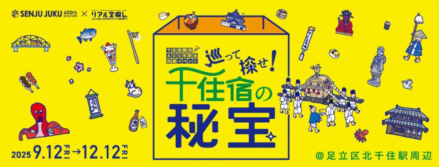 千住地域は、1625年(寛永2年)に「千住宿」として整備され、江戸四宿の中で最大の人口を誇った歴史ある街です。2025年の今年は、千住宿開宿400年を記念して、千住地域を巡るリアル宝探しイベントを開催中。千住にちりばめられたクエストをクリアして豪華賞品をゲットしよう!虹の広場にも、期間限定クエストがやってくる!参加登録をして「A-Festa」と宝探しイベントをダブルで楽しもう!